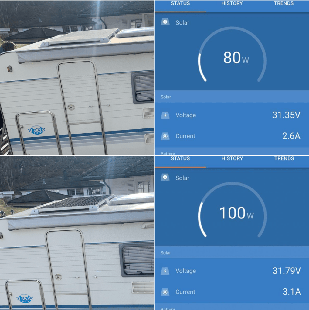 Jeg tenkte at dette må jo skygge for panelene under, så jeg sjekket målingene i Victron appen, så vasket vi panelet med vann og myk kost, deretter sjekket jeg målingene igjen.