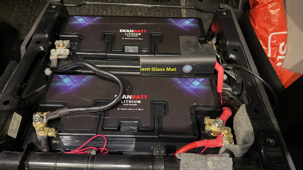 Siste er at de gamle 98Ah AGM batterier var defekte, disse ble byttet ut med 2 stk 180Ah Lithium og samtidig ble det montert en hovedstrømbryter som kutter minus polene ved vinterlagring.